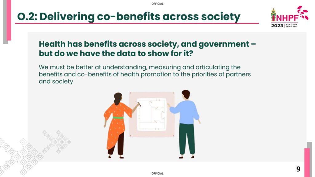 Moreover, the meeting highlighted the importance of delivering co-benefits across the society. This involves understanding, measuring, and articulating the benefits and co-benefits of health promotion, not only in terms of health outcomes but also in its broader impact on society. These co-benefits could include improved social and economic outcomes, enhanced community well-being, and a better overall quality of life.