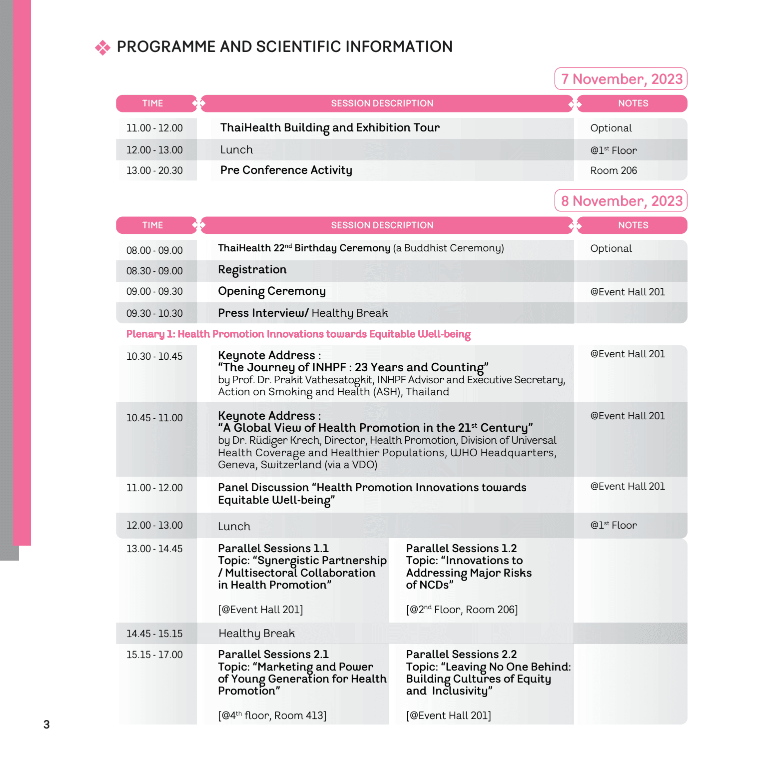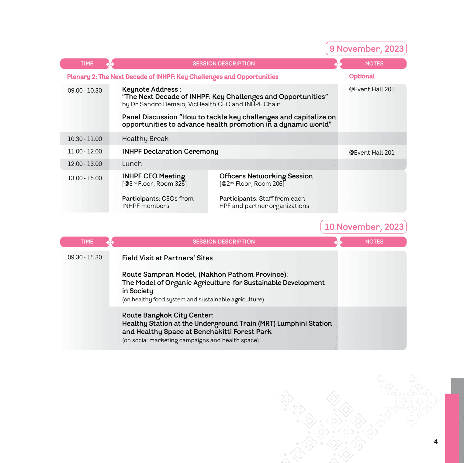 In this 20th edition of the INHPF Annual Meeting, the convener, INHPF, and the host, ThaiHealth, proudly offer 2 Plenaries, 4 Parallel Sessions, 2 Field Visit Routes deliberating health promotion best practices and innovations both from within Thailand and from around the globe to enhance equitable health and well-being for all. Moreover, the INHPF also aims to launch the Bangkok Declaration during the meeting to demonstrate the collective commitment on advancing health promotion in the global health agenda. In addition, numerous social & cultural activities and networking opportunities are included to enhance intercultural appreciation and strengthen interpersonal connections among all the participants.