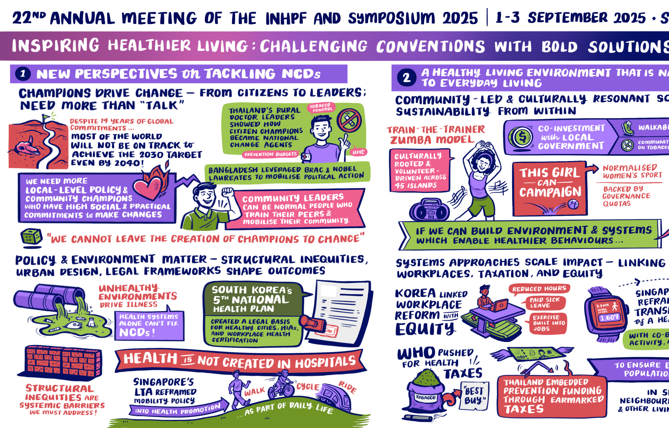 The 22nd Annual Meeting and Symposium of the International Network of Health Promotion Foundations (INHPF) was held from 1 to 3 September 2025 in Singapore, hosted by the Health Promotion Board (HPB) Singapore under the theme “Inspiring Healthier Living: Challenging Conventions with Bold Solutions.”
